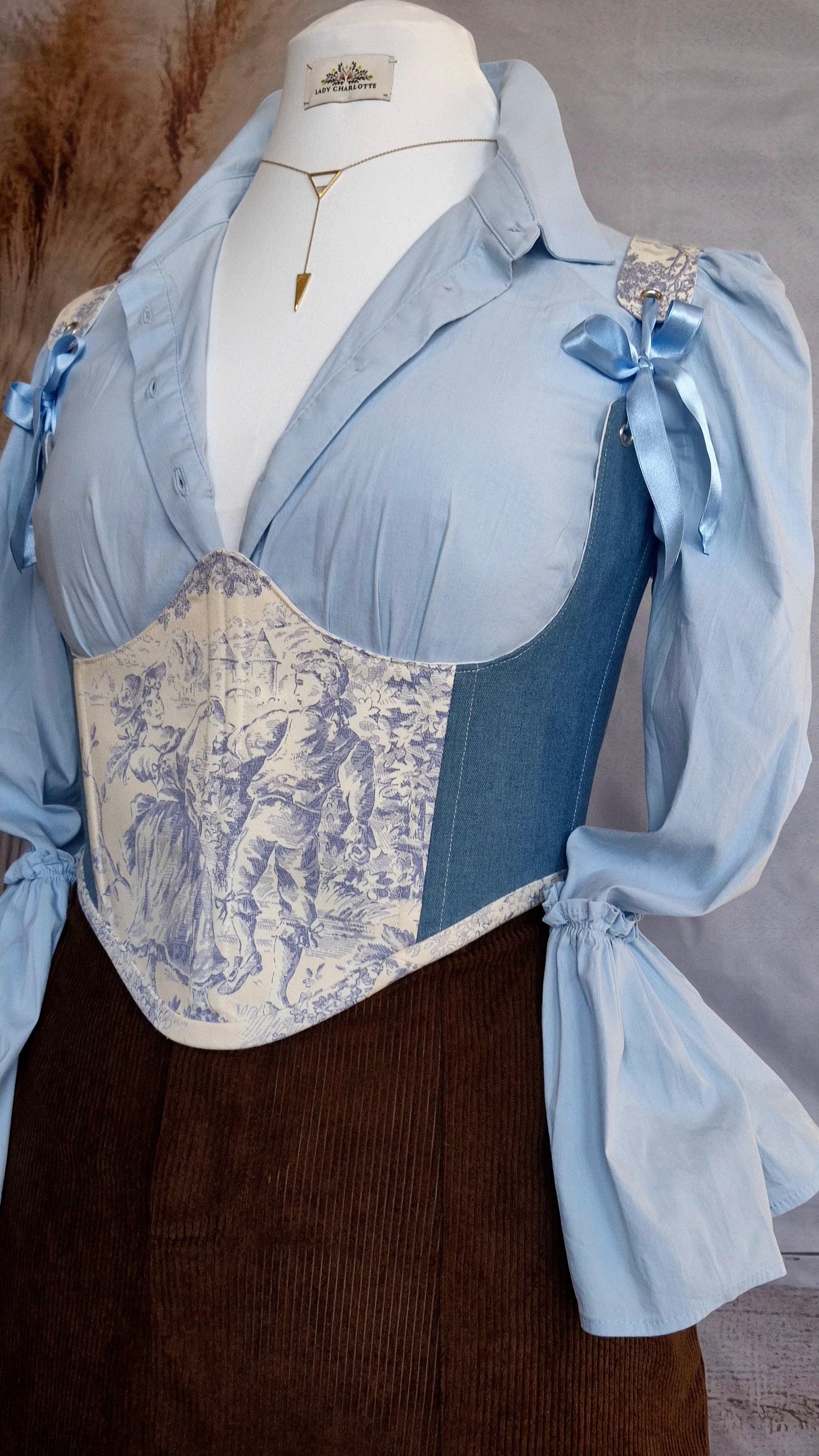 Une délicieuse union de la Toile de Jouy crème et d'un audacieux Bleu Jean. Qu'il soit porté sur un chemisier, glissé sur une robe de bal, ou même osé sur un simple pull, ce n'est pas un vêtement, mais une déclaration.